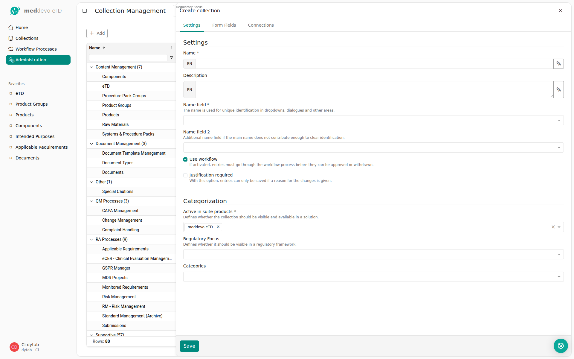 - The Regulatory Focus can be used if you want certain collections only visible for certain frameworks. For example the "IVS Codes" are only relevant for IVDR, so that they are not visible in the MDR. IF this field is left empty, the collection will be displayed for all frameworks.