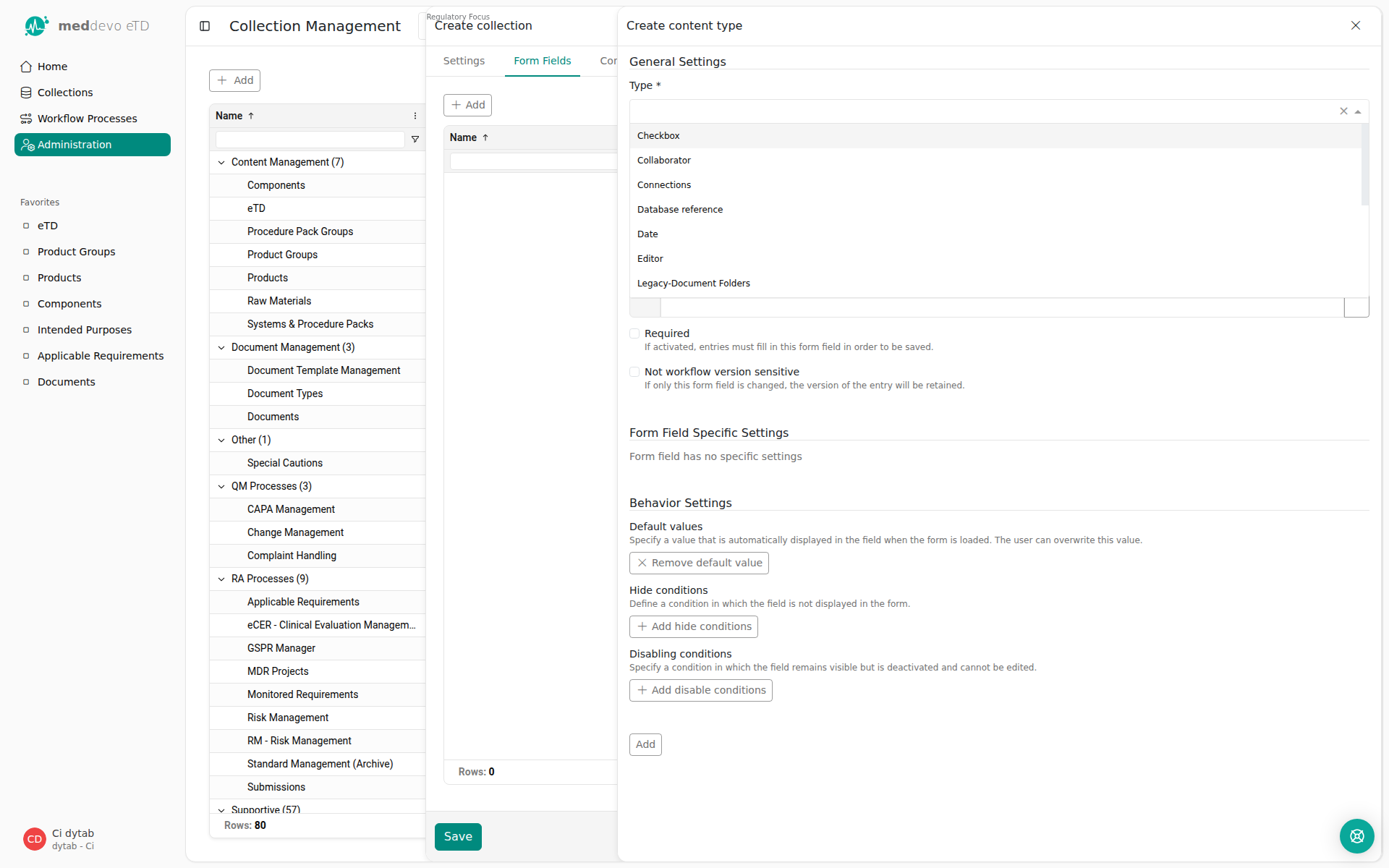 A collection in meddevo is the central structure where all data of the same type are grouped together. It is equivalent to a table in a relational database system. When you start out with meddevo, the system already comes preconfigured with different collection related to the relevant regulatory datapoints that are relevant for technical documentations.